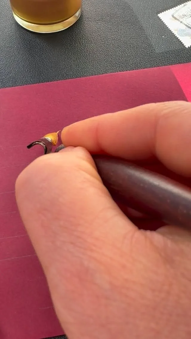 A word of warning – avoid using fountain pen inks for pointed pen calligraphy. They are thinner than calligraphy inks and maintaining a steady ink flow can be a challenge with them!